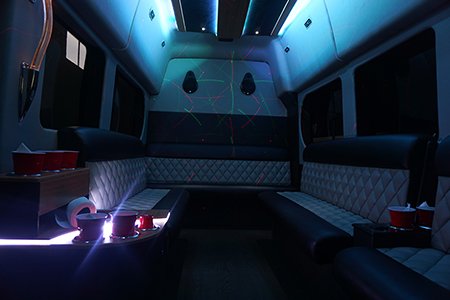Our black Ford Transit van offers a completely customized interior with a unique look and atmosphere. It offers all the luxury of a stretch limousine but in a smaller package so you can enjoy a party ride at a more economic cost if you've got a small group!